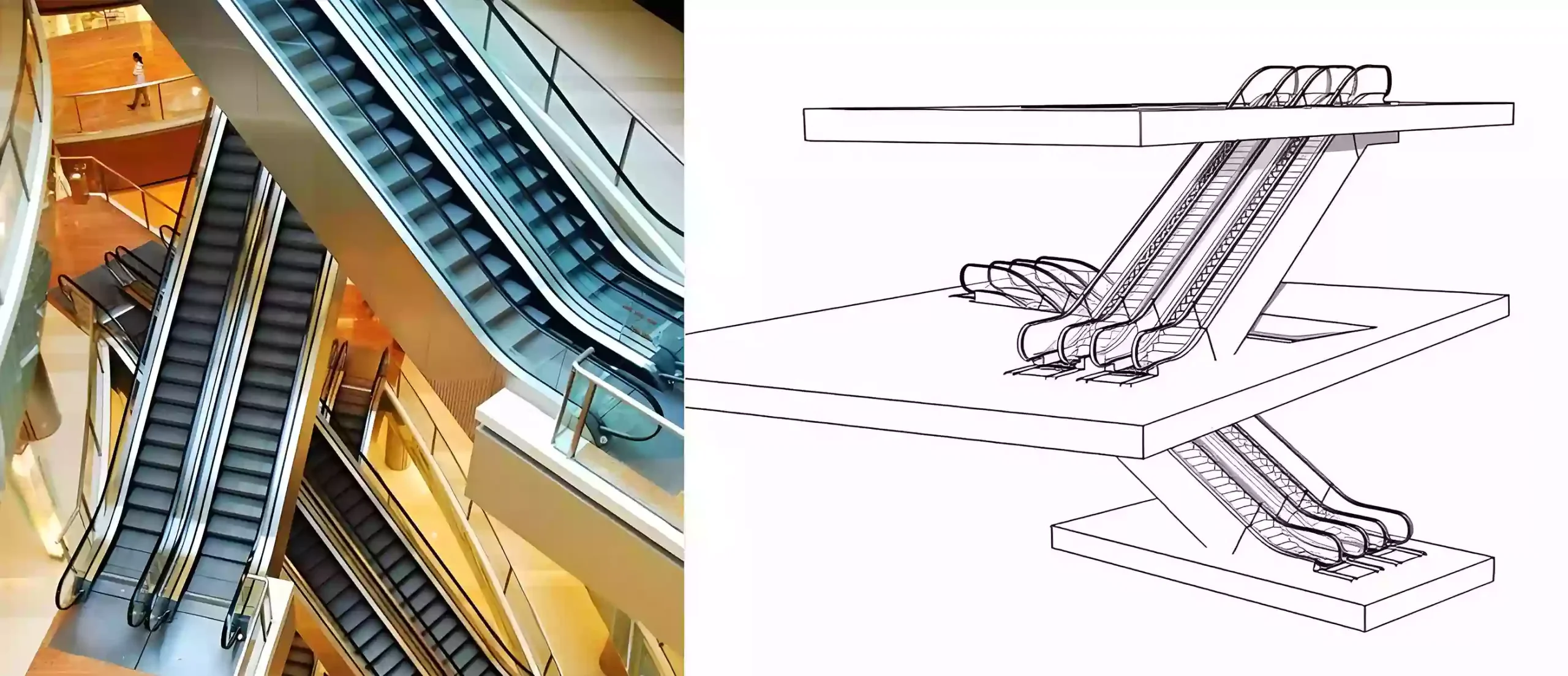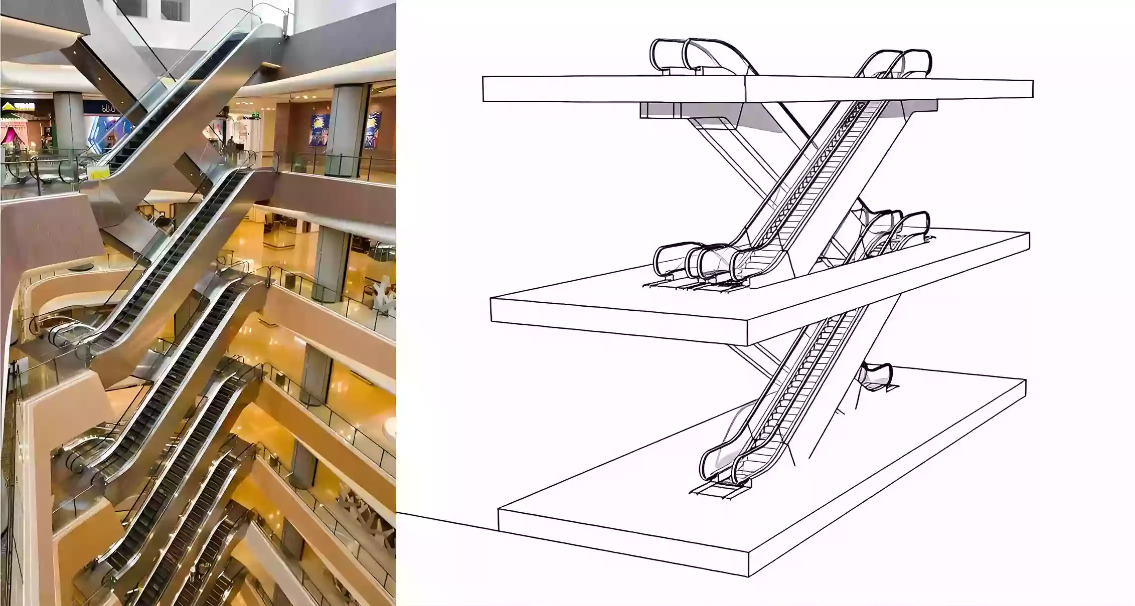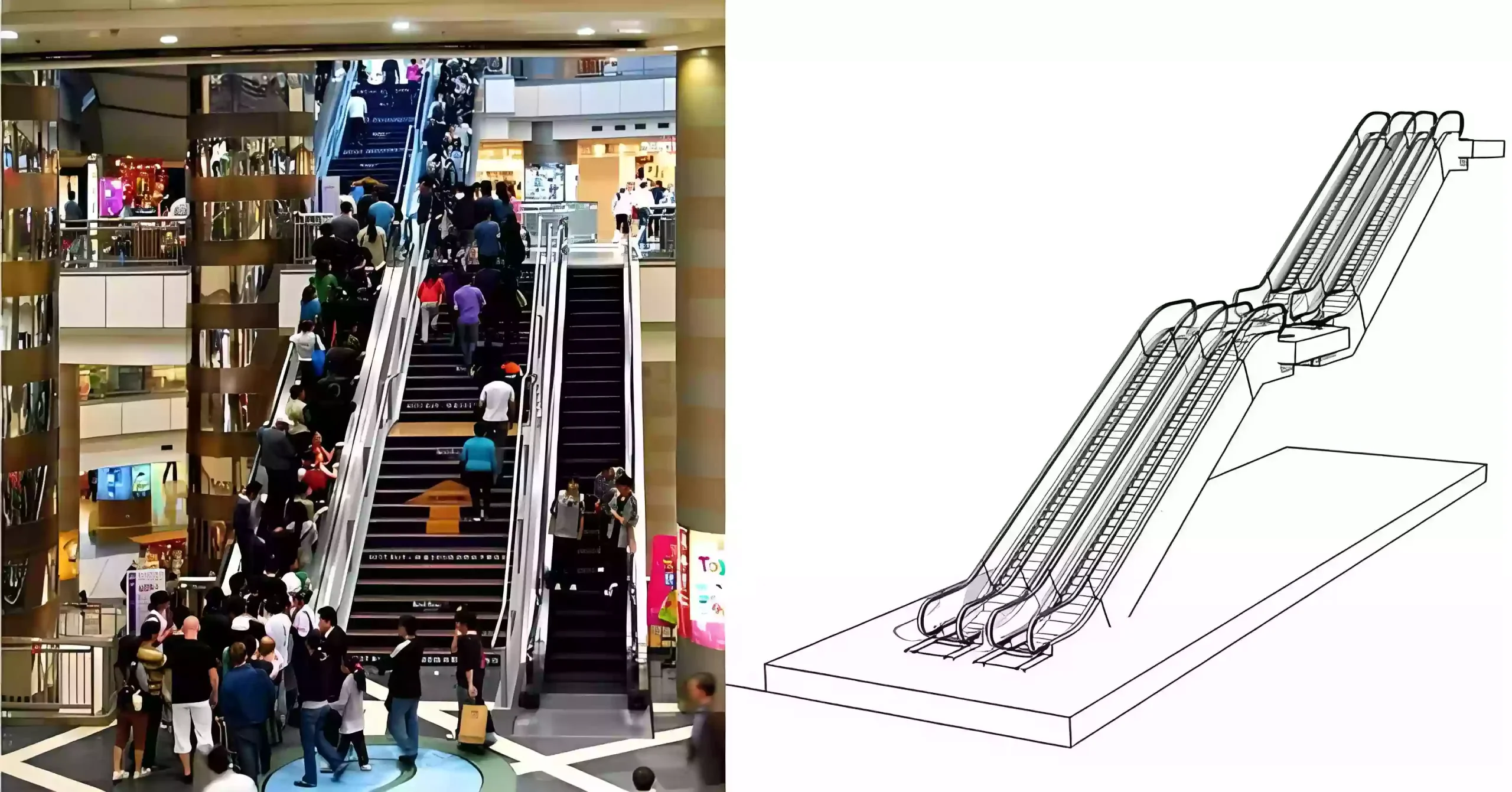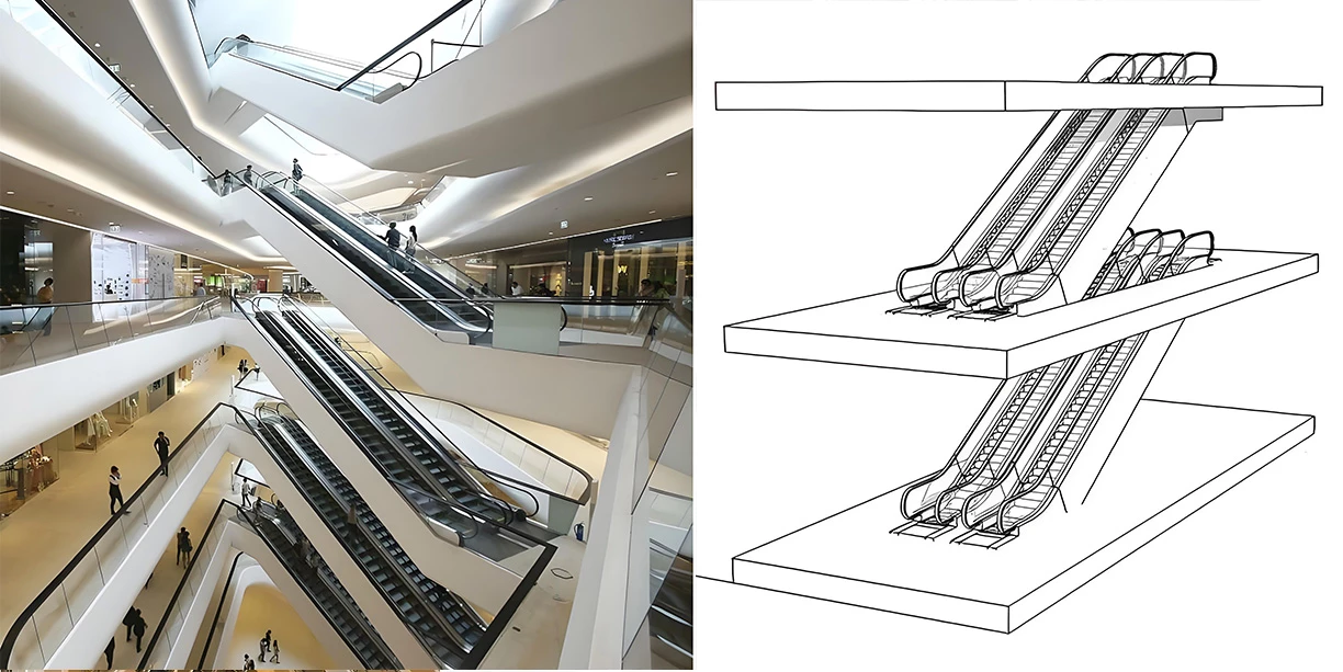 Two escalators side by side with staggered direction. Not as smooth for transfers, but can move larger flows of people. Common in department stores or exhibition halls.
