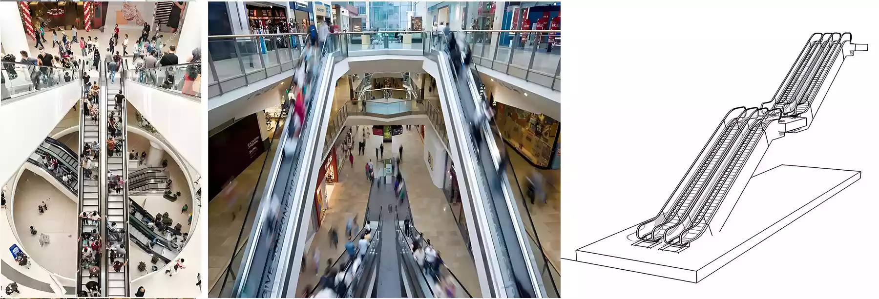 Escalators placed in a straight line, floor after floor. Smooth transfer between levels, often used to pull shoppers quickly into the center of a mall.