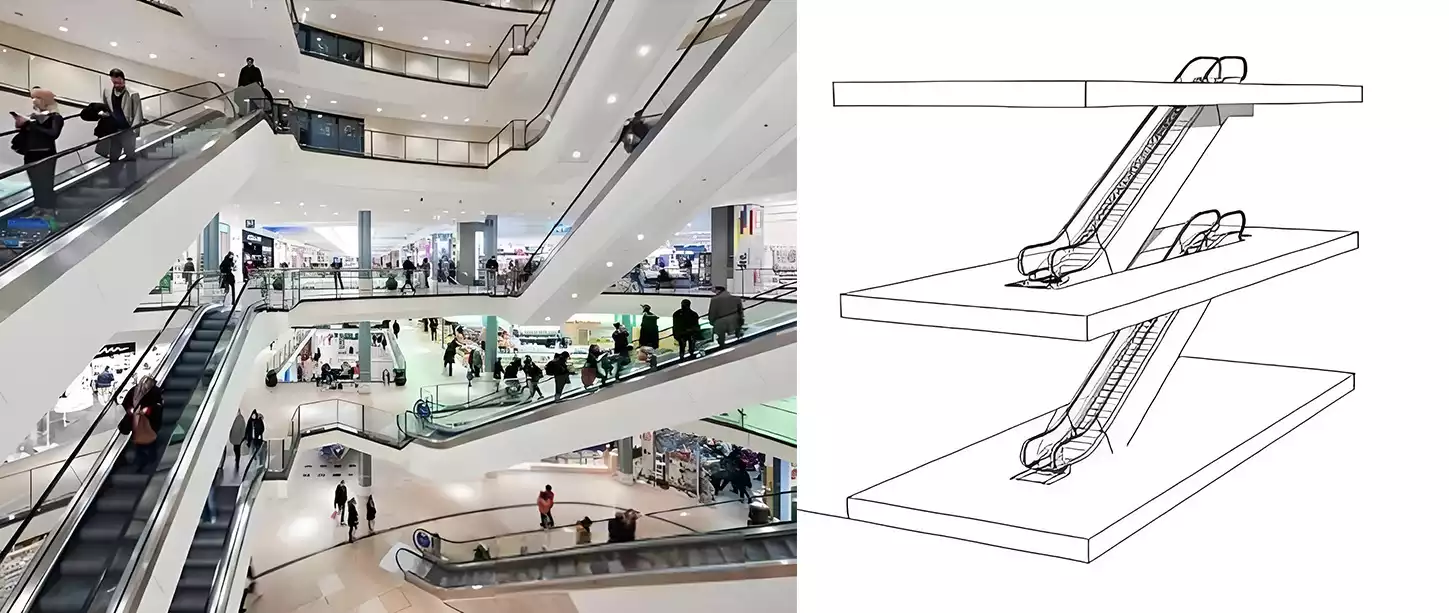 Escalators offset in a staggered criss‑cross. Prevents bottlenecks at the landings while also guiding shoppers along certain paths.