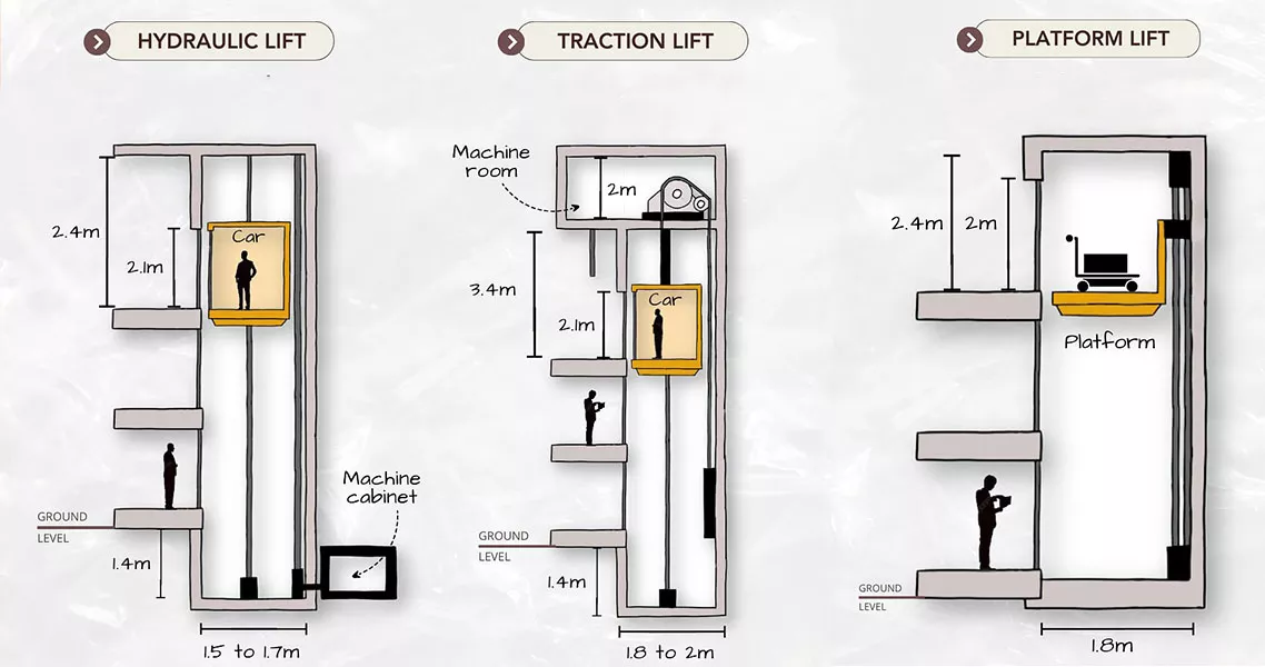 In an existing building, different types of elevators will change how much the building needs to be rebuilt. Some types need more work on the structure, and some need less.