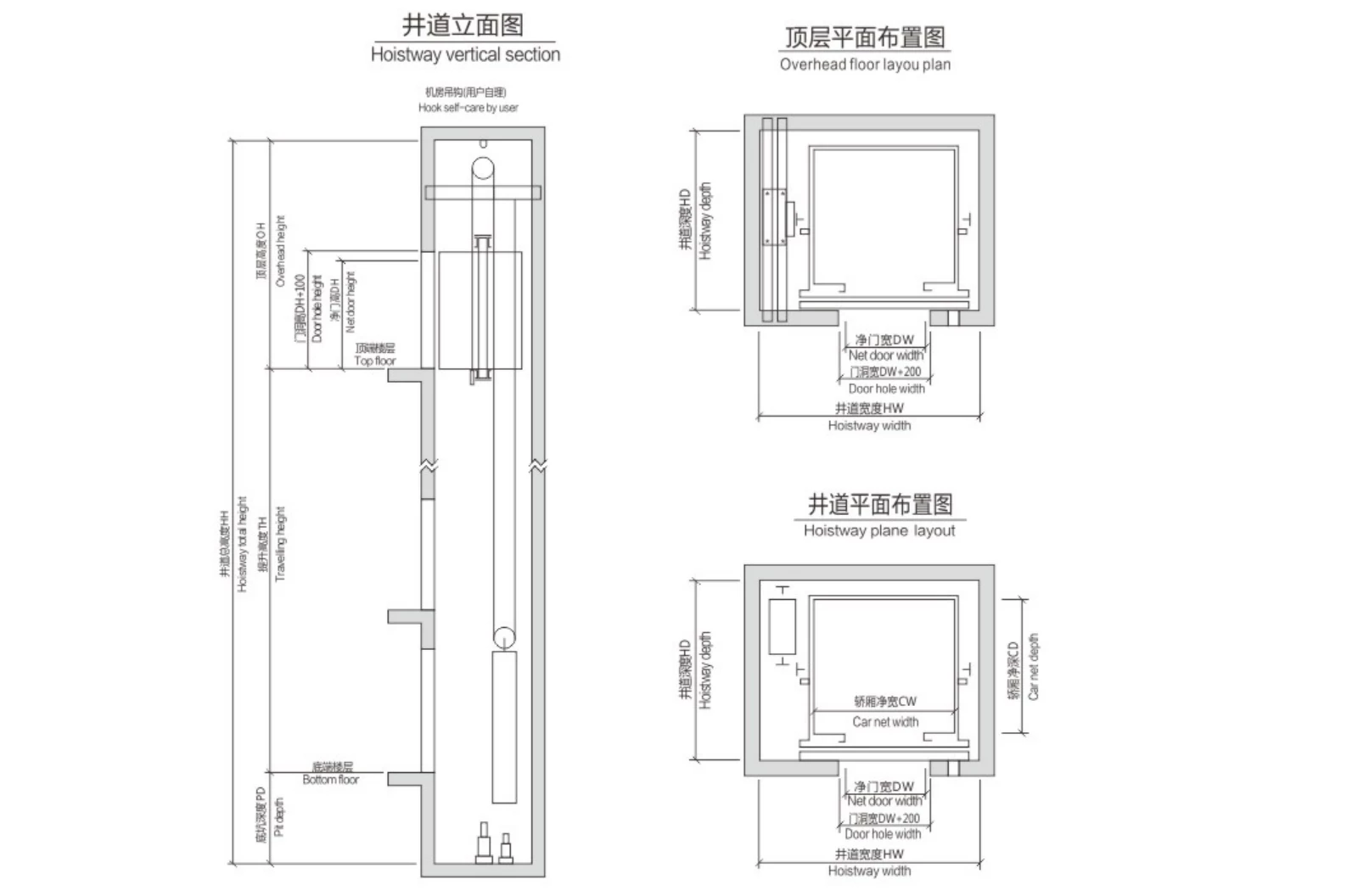 | Person | Rated capacity (kg) | Rated speed (m/s) | Net size of car (mm) C.WxC.D | Net size of door (mm) D.WxD.H | Shaft size (mm) HxD | OH | PD | Maximum lift height (m) |