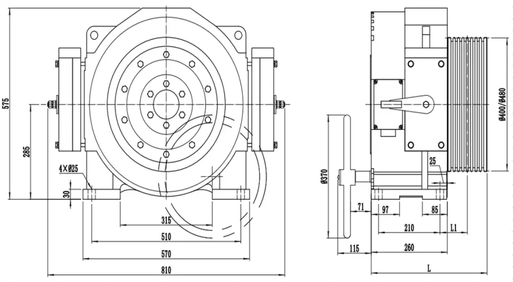 | Type | Spec | Elv Load (kg) | Elv Speed (m/s) | Sheave Diam (mm) | Current (A) | Power (kW) | Speed (r/min) | Freq (Hz) | Torque (N.m) | Poles | L (mm) | L1 (mm) |