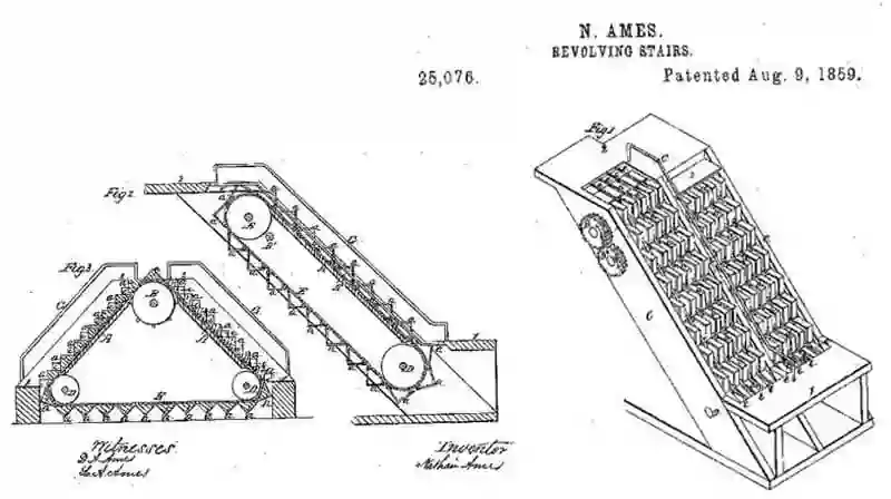 However, some accounts also point to George Wheeler, who patented a step-style design the same year. His machine more closely resembled modern escalators, though it was not displayed in public with the same success. What is true is that Nathan Ames, decades earlier in 1859, had already imagined the idea in his “revolving staircase” patent, even if it remained only on paper.